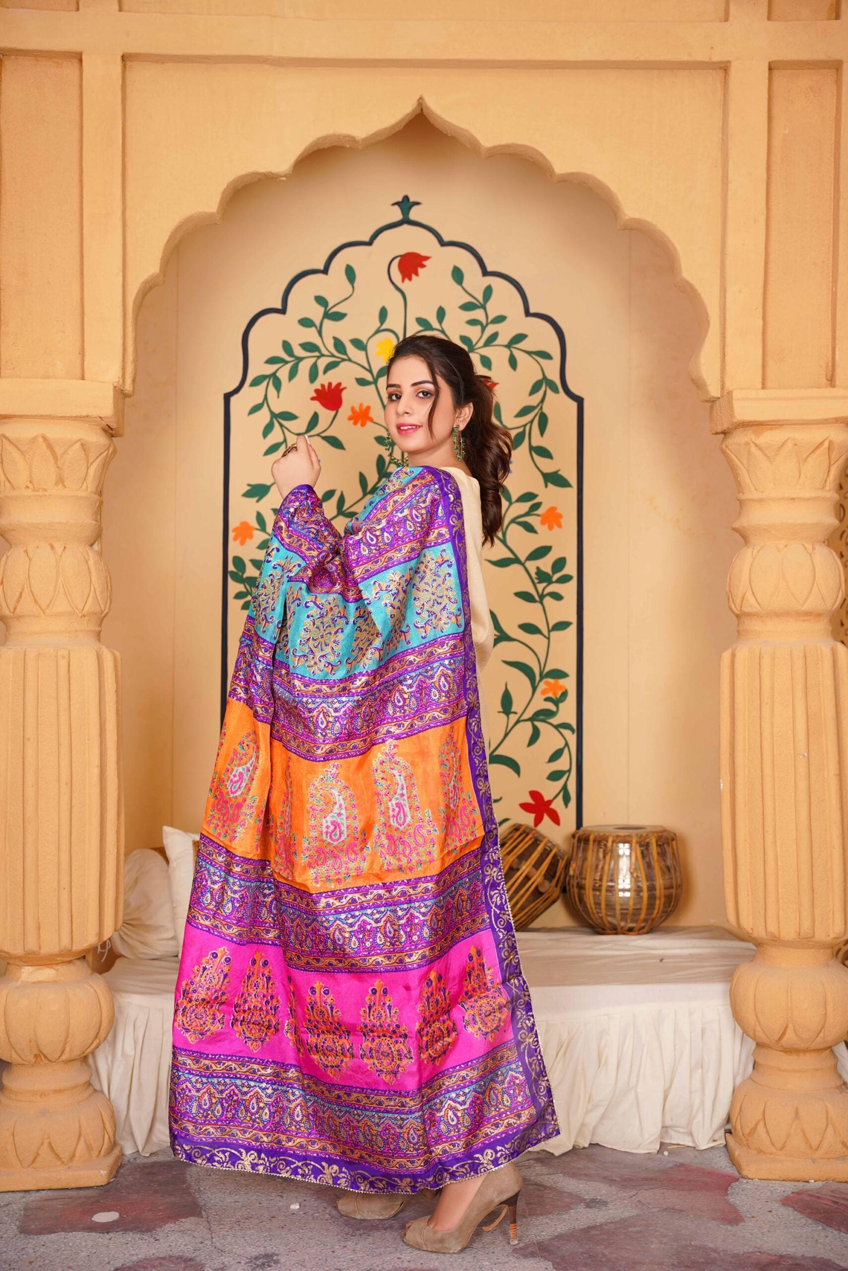 This beautiful shawl is crafted from pure medium silk and features block printing in a classic pattern. Its high-quality material is lightweight and soft, providing a beautiful drape. The delicate design ensures the perfect finishing touch for your look.