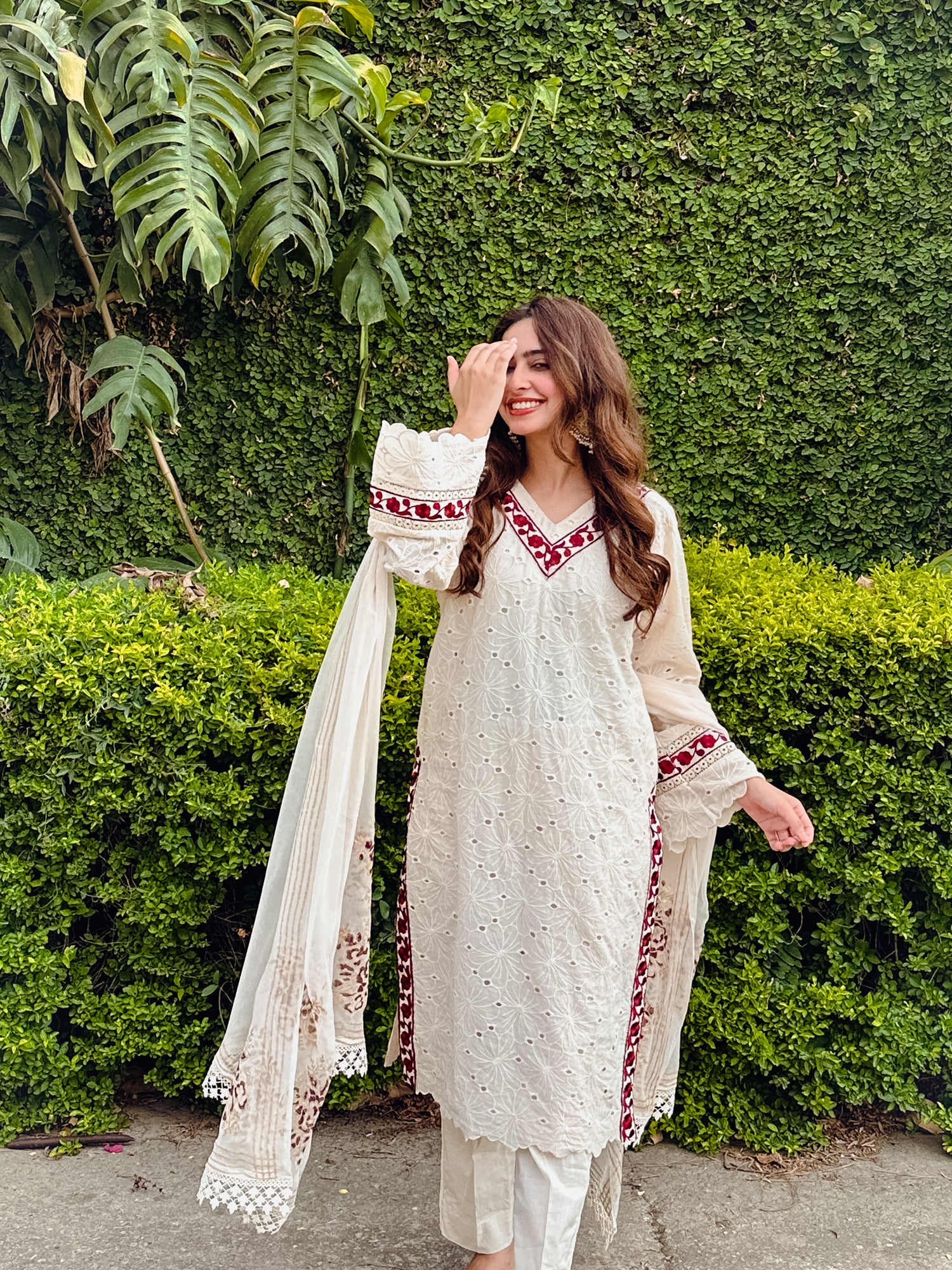 Make a statement this Eid with our beige lawn chikan shirt, featuring maroon resham thread embroidery. Paired with lawn cotton trousers with lace detailing and a pure bamber chiffon dupatta adorned with block print motifs on all four corners and a lace finish, this ensemble is perfect for the festive season.