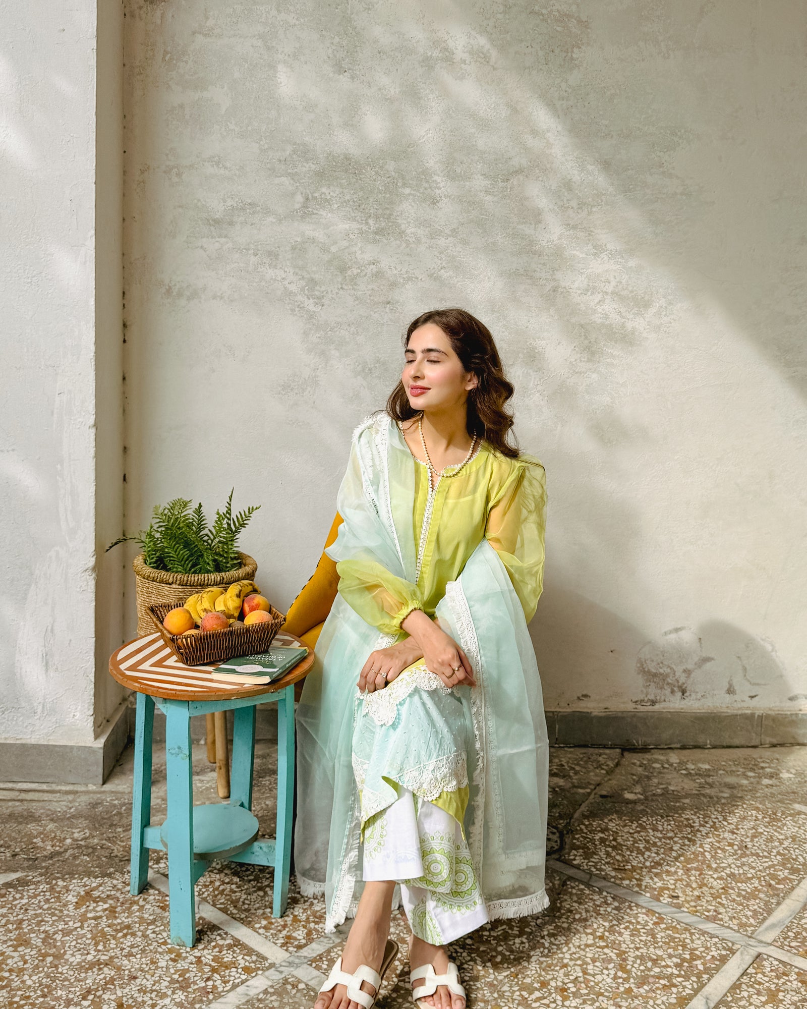 Celebrate Eid in elegance with our lime green Swiss lawn shirt, featuring brochea fabric on the daman with lace details and organza puff sleeves. Paired with cotton printed trousers and an organza lace-finished dupatta in a striking sky blue contrast, this outfit is perfect for the festive season.