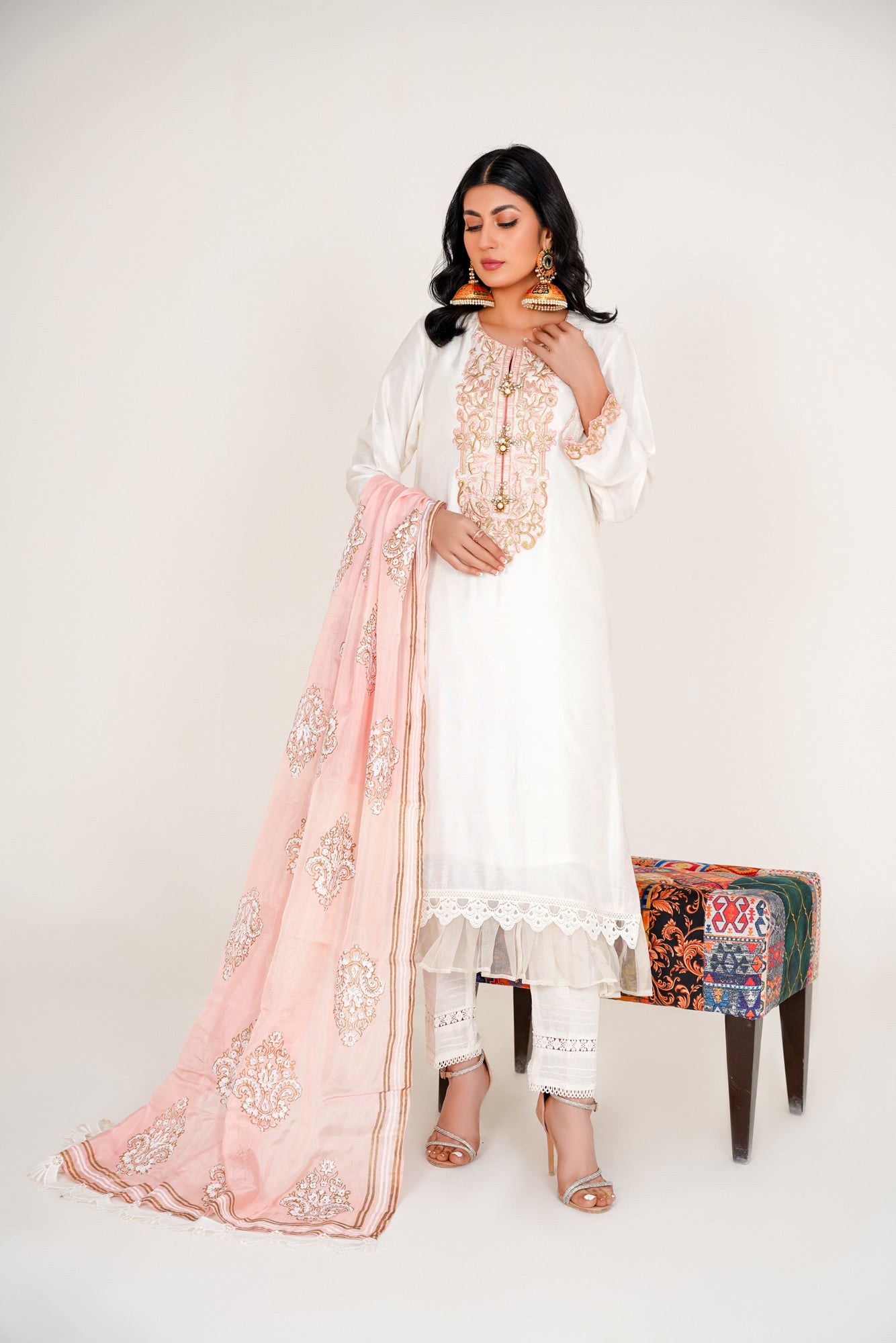 A pristine white cotton silk shirt adorned with intricate embroidery on neckline and sleeves, complemented by raw silk laced trousers and finished with an organza frill on the daman, paired with a graceful peach silk block printed dupatta.